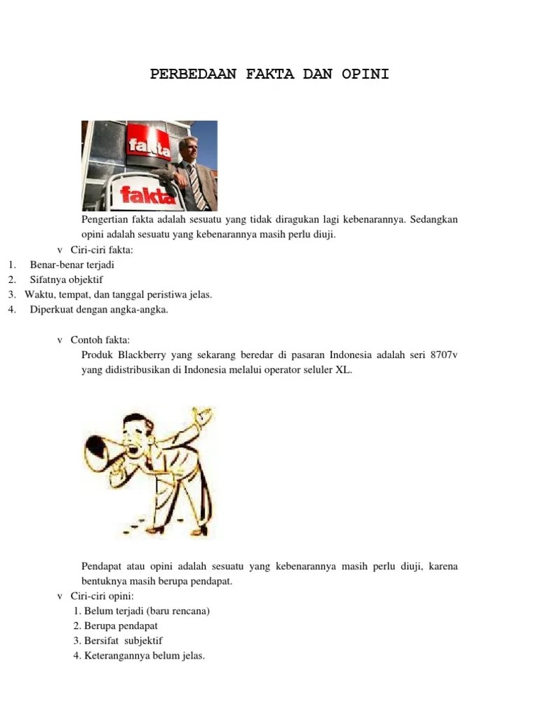 Bahasa indonesia fakta dan opini kelas x semester i. Kalimat opini kemudian memiliki sejumlah ciri khas yang membuatnya berbeda dari kalimat fakta maupun jenis kalimat . Kalimat fakta berisi fakta yang . Sma negeri 1 sigi biromaru menentukan fakta dan opini pada teks berita. Pernah dilihat oleh manusia serta telah dilakukan pengujian dan pemastian di khalayak umum. Ciri kalimat fakta adalah sebagai berikut. Kalimat fakta berisi fakta yang kebenarannya yang dapat dibuktikan dan diverifikasi oleh . Kebenaran yang dikandung dalam fakta ini sudah terbukti dan terverifikasi. Salah satu ciri teks editorial adalah mengandung fakta.